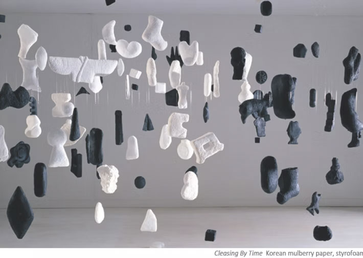 Kim Hyungjoo transforms dakjongi (mulberry paper) from a support into a sculptural material shaped by time and touch. Built through layering, pressing, and drying, the surface shifts with light-revealing fiber, relief, and traces of the hand-linking Korean tradition to contemporary sensibility.