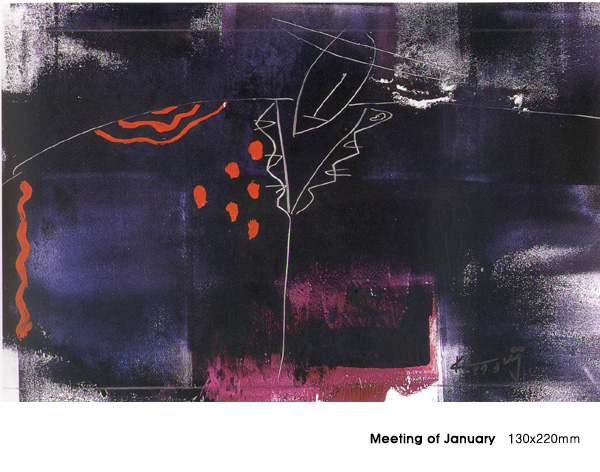 Hyungjoo Kim’s painting practice serves as a direct conduit for her “inner voice,” communicating universal themes of humanity, nature, and healing through abstract expressionism. Moving beyond the structural discipline of her fiber art, her canvases utilize a fluid mix of acrylic, ink stick, crayon, and watercolors to explore the concept of “Cosmic Circulation” and the rhythm of life.