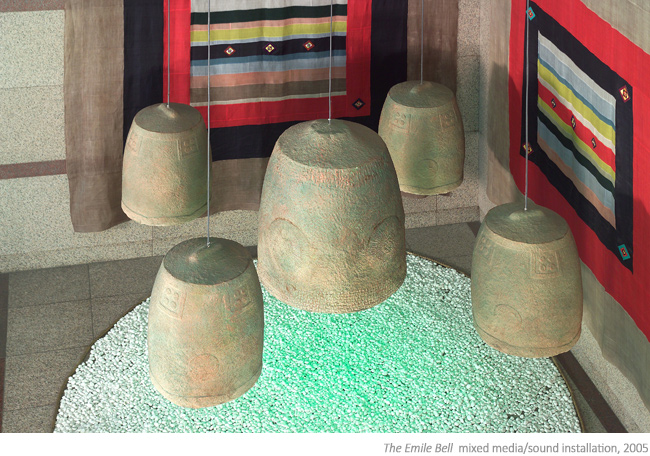 Hyungjoo Kim created these bells to symbolize the tranquility and beauty evoked by the sound. One can feel the meditative moment in the installation site, the physical and sensing of art. One day her mother and Huyngjoo Kim visited the Buddhist temple for the 3000 bows. During this visit, Hyungjoo Kim heard and experienced the pinging sound of a bell, the Bell Emile. In Korean, Emile is the also the sound of an infant crying for his / her mother. That sound touched her heart incredibly. Ever since then, Ms. Kim had been recreating this sound of the bell the whole of her artistic life.